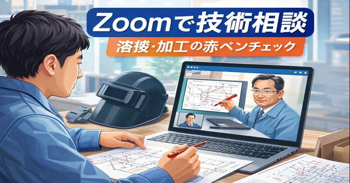 Zoomで図面を共有しながら、溶接管理技術者が赤ペンで加工アドバイスを行う技術相談のイメージ。作業服姿の技術者が図面を前にオンラインで指示を受けている。
