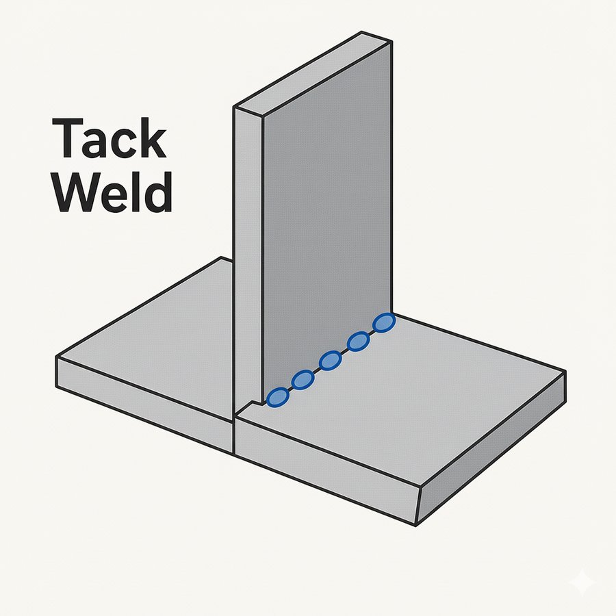 T継手におけるタック溶接の模式図。母材の位置決めと歪み防止を目的として、最終溶接前に数点を仮付けする工程を示している。