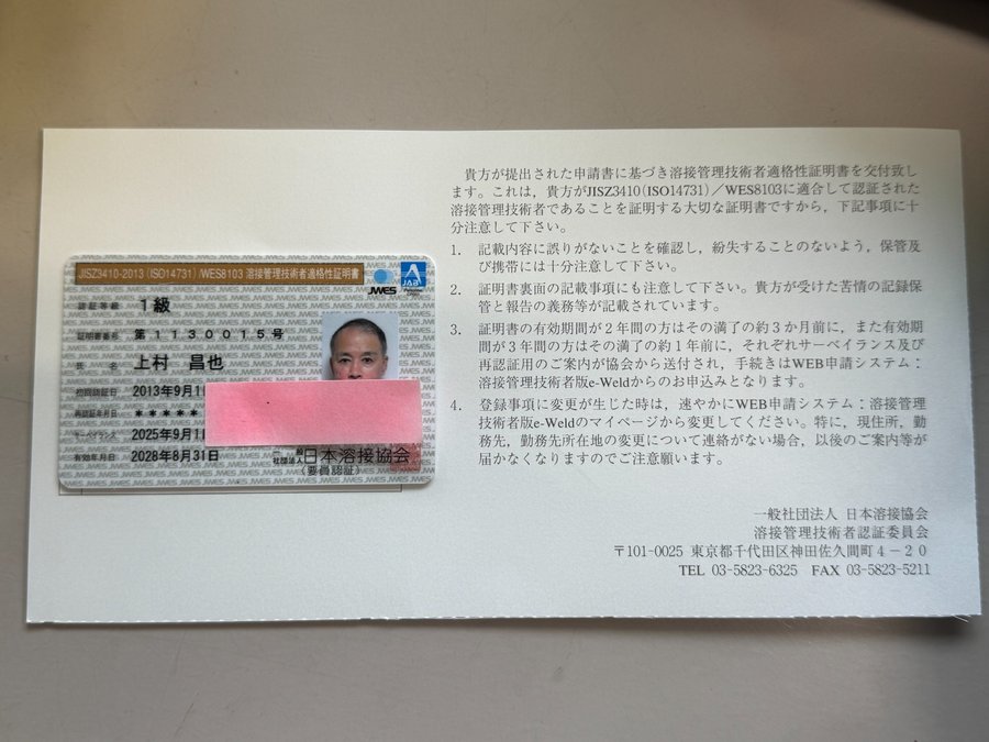 wes8103_card_resized 2025.09.16 この記事のタイトルとURLをコピーする WES8103溶接管理技術者1級 合格証と認定証明書 Post Share Line RSS Pin it note 投稿者: kamimura-web コメント: 0
