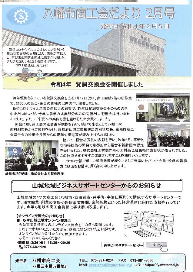 yawatashisyoukoukaidayori-022022 2022.02.14 2025.08.28 この記事のタイトルとURLをコピーする 八幡市商工会賀詞交換会で表彰!技術と発信力が評価されました Post Share Line RSS Pin it note 投稿者: kamimura-web コメント: 0